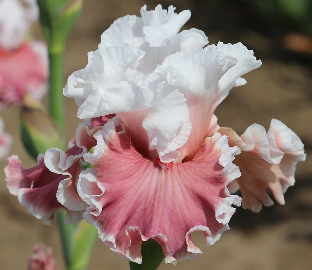 Lovely Livvy was named in memory of the beloved Olivia Newton-John, and it carries the same grace and luminous presence. 35″ (89 cm), Early to Midseason bloom. The standards are white, softly flushed pink at the centers; style arms mirror the white. The falls are deep rose pink, edged with a ruffled white band. Beards are white at the base, tipping to red-orange at the ends. A slight fragrance enhances its appeal. (Thomas Johnson, 2023).