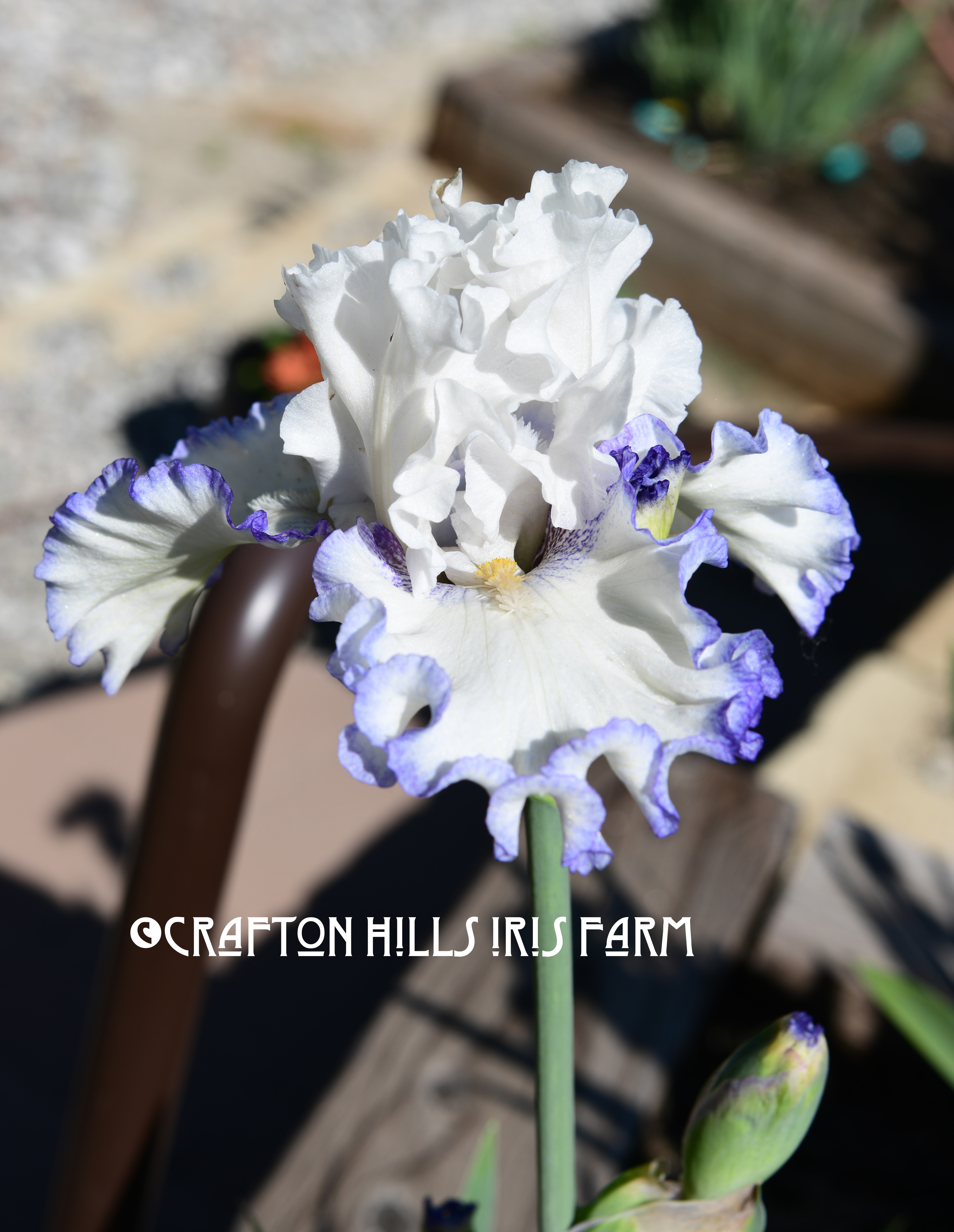 37″ tall with midseason to late bloom. Standards are pure white; style arms are white, with blue inner center behind anther; falls pure white, with a ¼˝ mid blue plicata stitched edge. It has deeper blue hafts reaching across to beard, and is very ruffled; beards yellow on white, white ends. (Blyth, 2022)